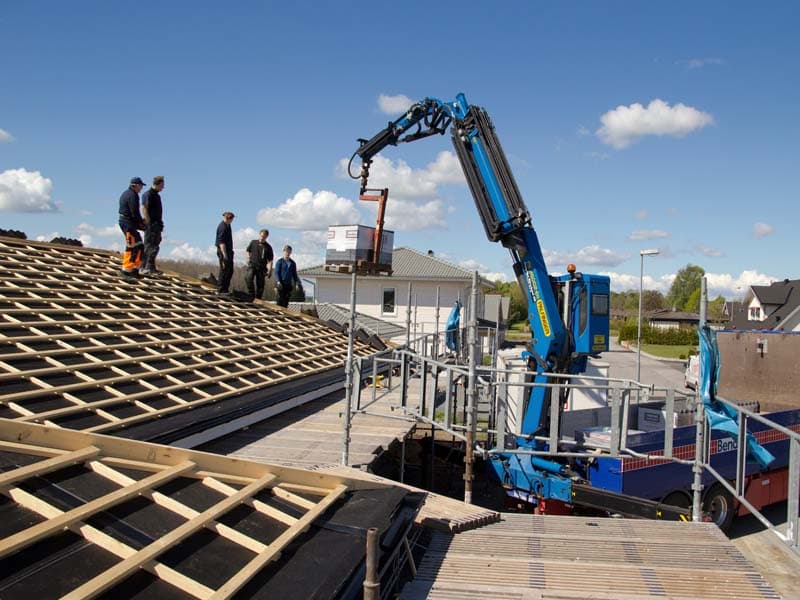 Bilde: Takløft med pallegaffel er trygt og effektivt, men det er krana – ikke snekkerne – som skal bevege seg mest. (Foto: Benders)